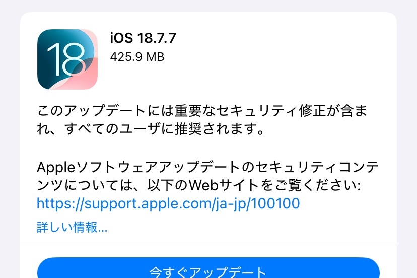 iOS 18やiPadOS 18の対象機種の場合には「設定」→「情報」→「ソフトウェアアップデート」から行います。単体でアップデートする場合のダウンロードサイズは手持ちのiPhone XS MaxでiOS 18.7.6からの場合では425.9MBとなっています。更新は従来通りにiTunesをインストールしたWindowsおよびMacとUSB-Lightningケーブルで接続しても実施できます。Appleが案内しているアップデートの内容およびセキュリティー修正は以下の通り。なお、これまでのAppleの動きからすると、今後もしばらくはiOS 18やiPadOS 18へのセキュリティー修正が継続して提供されると思われます。