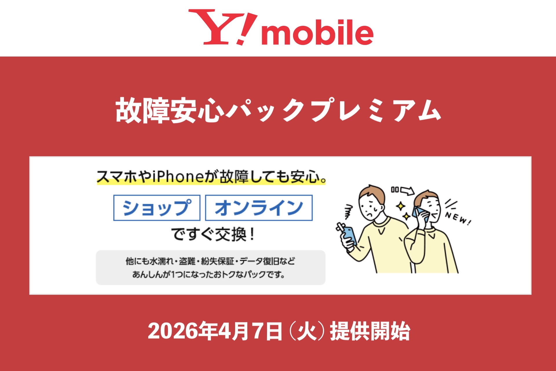 ・「故障安心パックプレミアム」を4月7日(火)に提供開始 / 2026/3/24|新着情報|お知らせ|Y!mobile - 格安SIM・スマホはワイモバイルで