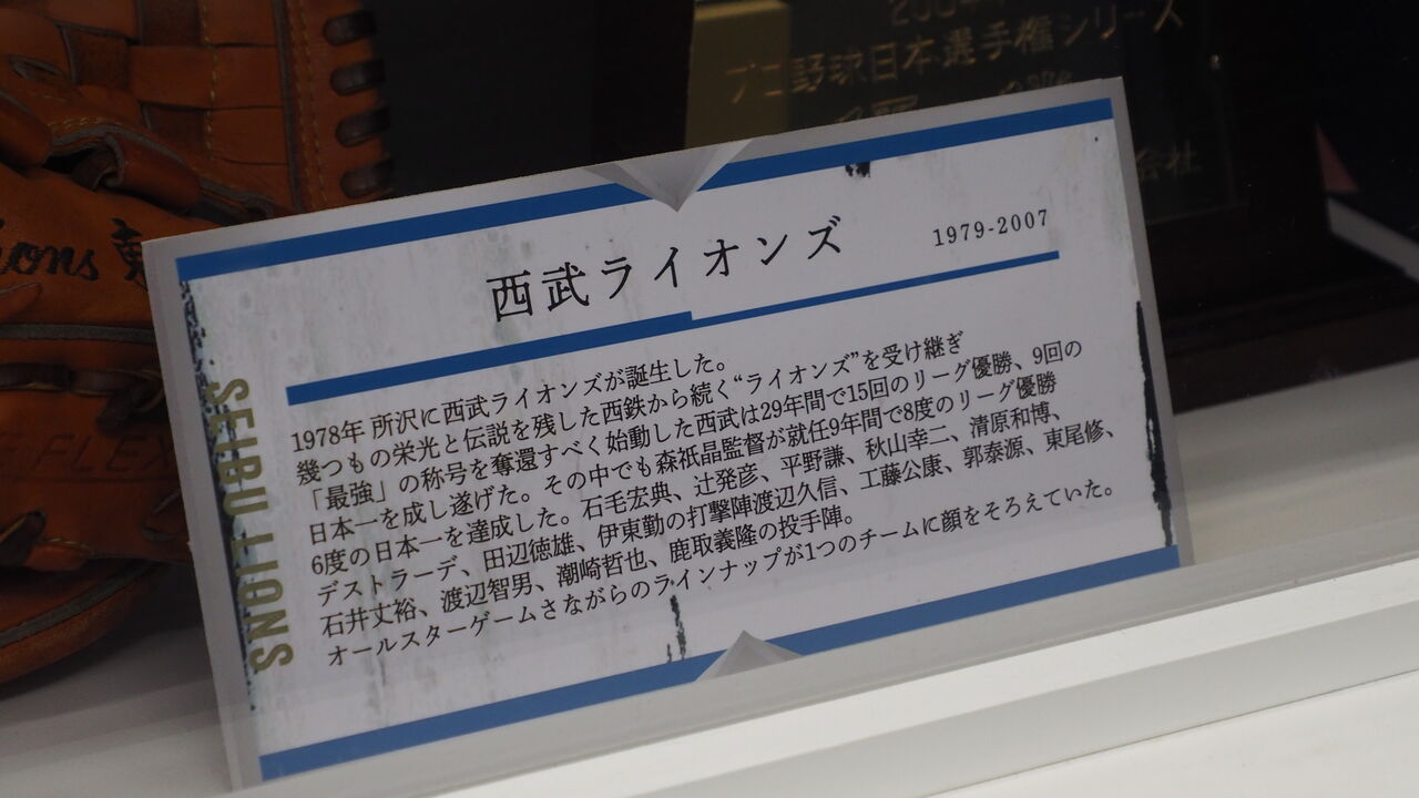 場内では取り立てて目新しいものはありませんでしたが、電車の車両を活用した展示スペースで、ライオンズの栄光の歴史を振り返る展示がされていたので、そちらを見て「K」の痕跡を確認することに。いつも通り、バットだのグローブだの目立つ展示からは「K」の痕跡が排除されており、貼られた写真も絶妙に「K」が見えないものばかりでしたが、説明文には「K」の名前を確認することができてひと安心。「積極的にチョイスはしないが、全部コンプリートする機会には消すまでではない」というラインを感じることができて、よかったなと思います。