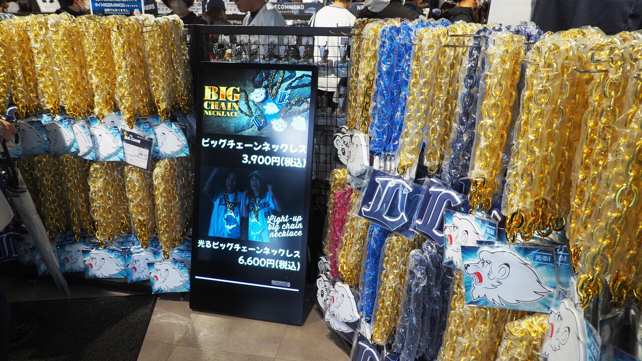 しかし、ご安心ください。ライオンズファンは決して消滅してしまったわけではなかったのです。土産でも物色しようと公式グッズストアに向かえば、そこにはライオンズファンがごった返し、前にも後ろにも進めないほどの大にぎわいになっているではありませんか。そうか、みんな雨だからストアのなかにいたんだ!僕も嬉しくなってストアにインすれば、入口には昨年大ブームを巻き起こしたビッグチェーンネックレス…通称クソデカネックレスが早速ズラリと並んでいます。さらに今季は進化系として光るバージョンも登場しているとのこと。僕は買いませんでしたが(!)、ライオンズファンなら買うしかない逸品です!