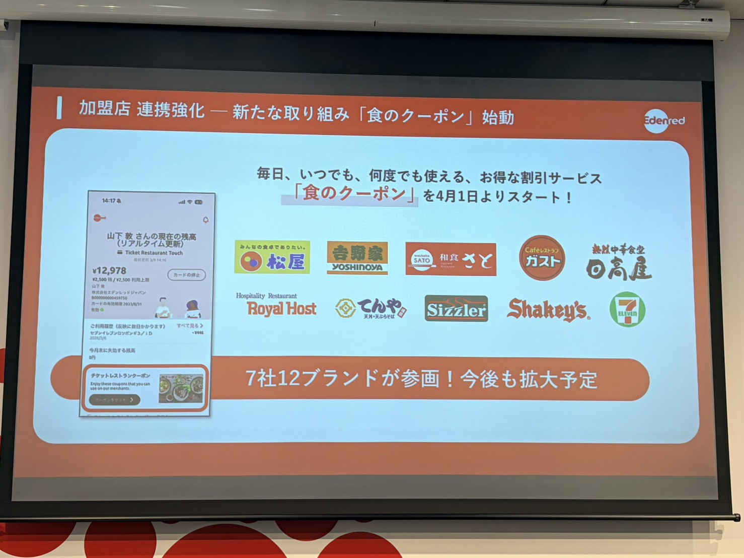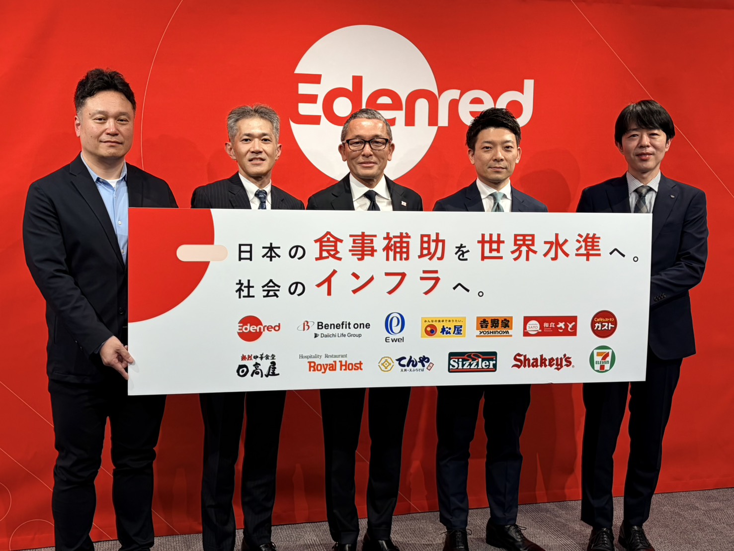 発表会には、エデンレッドジャパンのほか、ベネフィット・ワン常務執行役員 サービス開発事業部長 古賀清氏、イーウェル執行役員 HRソリューション本部 本部長 梶村幸輝氏、松屋フーズホールディングス ITソリューション部 部長 今野慎一郎氏、吉野家ホールディングス 企画本部 マーケティング企画部 部長 寺澤裕士氏も参加。日本の食事補助を世界水準に引き上げるため力を合わせたいと意気込んでいました。