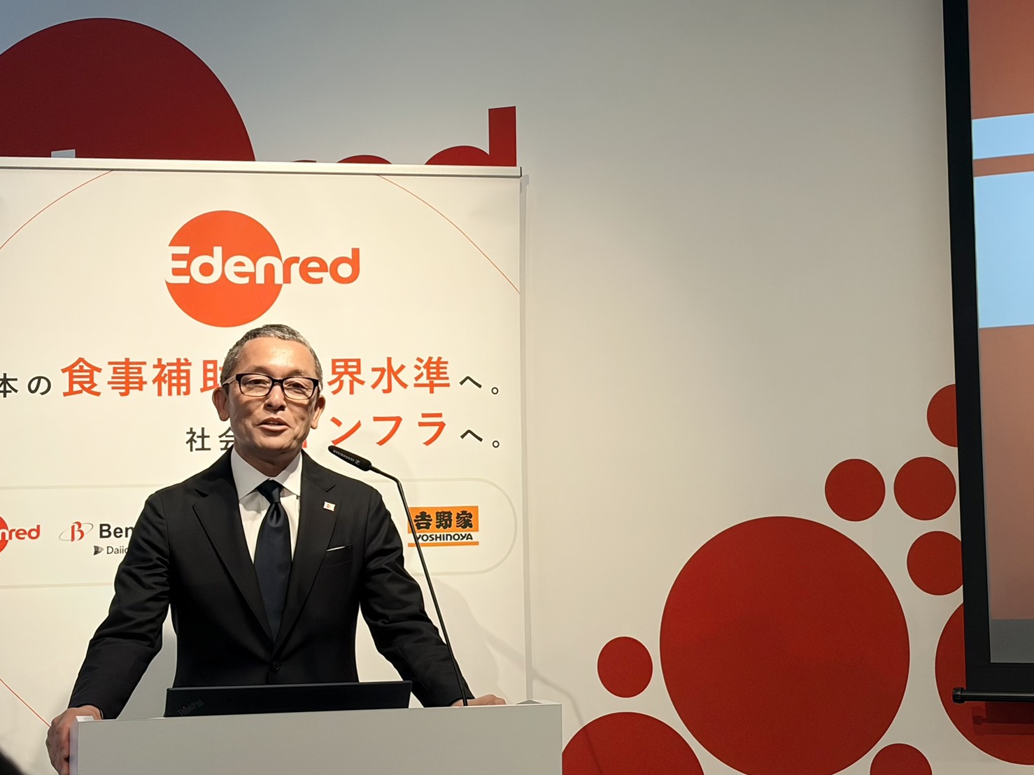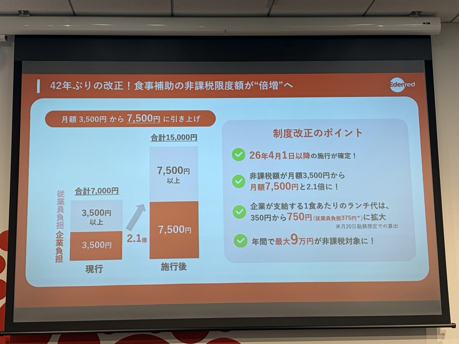 エデンレッドジャパンの代表取締役社長 天野総太氏は、「欧州をはじめとする諸外国は、食事補助の導入が50〜70%に達し、所得税が非課税となる食事補助額の上限は月額2万5000円〜3万円と高水準にある」と話します。一方で日本では、国内企業の食事補助導入率は14%程度だそう。「食事補助制限は42年にわたり月額3,500円に据え置かれてきました。この状況を打破すべく、食事補助の世界水準への引き上げを政府へ働きかけてきました」と天野氏。