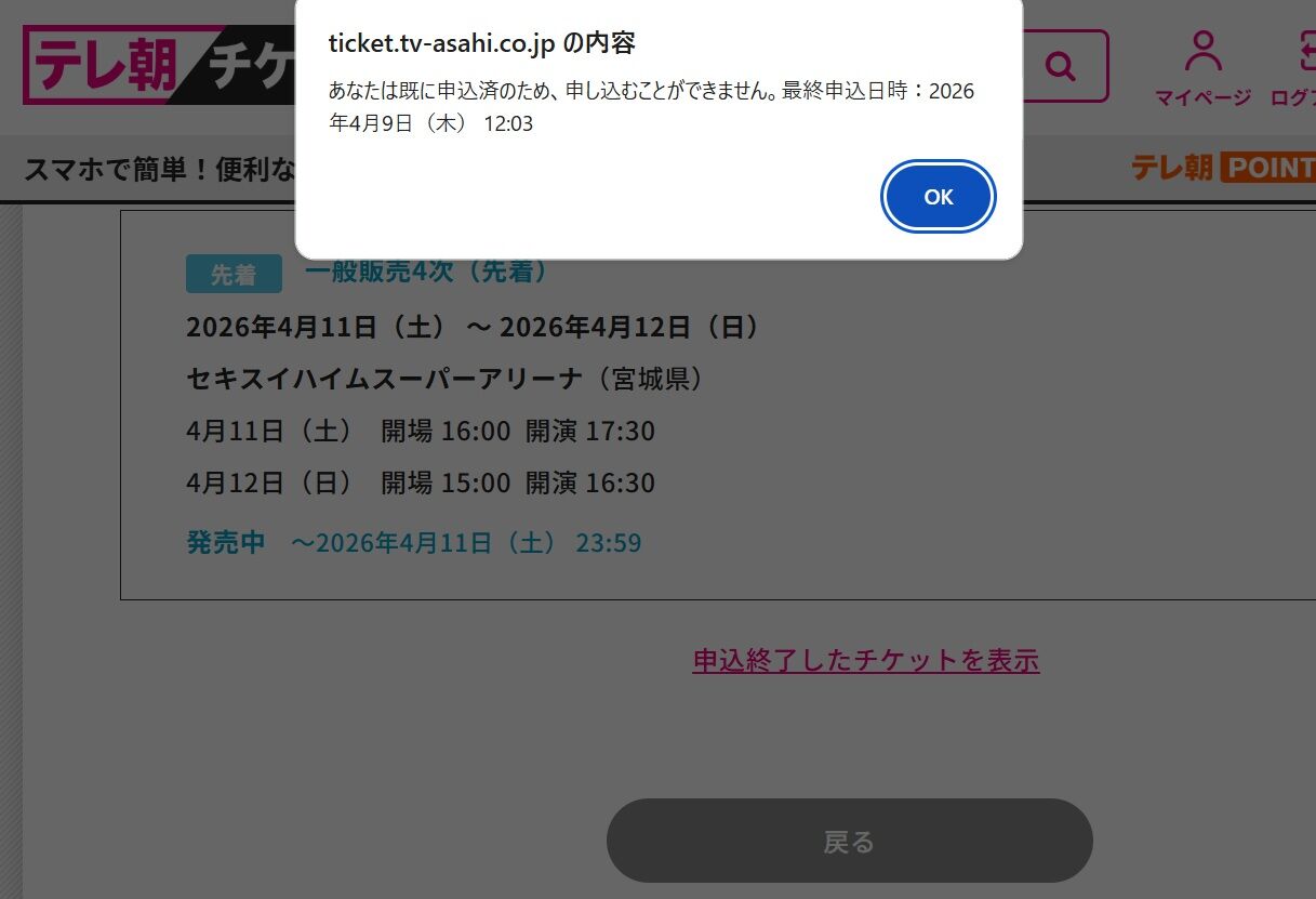 このとき、何の時間制限もなく選べるなら「できればアリーナS席(最前列)がいいです!」とか、「今回はせっかくなので立見でいきますか!」など席種選びをするのでしょうが、今は何枚残っているかわからないものを早い者勝ちで取り合っている争奪戦の最中です。購入途中で残席が尽きる可能性も含めて、なるべく残席が多そうな席種にできるだけ早く突っ込む、それしかありません。SS席、S席、A席から最初にカーソルが合ったところにいく、その気持ちでズバババッと申し込みを進めます。途中で一度残席尽きたのか購入に至らないということがありましたが、それもすかさず察知して「席種変更!」と手順をやり直し、申し込みが完了したのは12時2分。2分間の激闘でした。