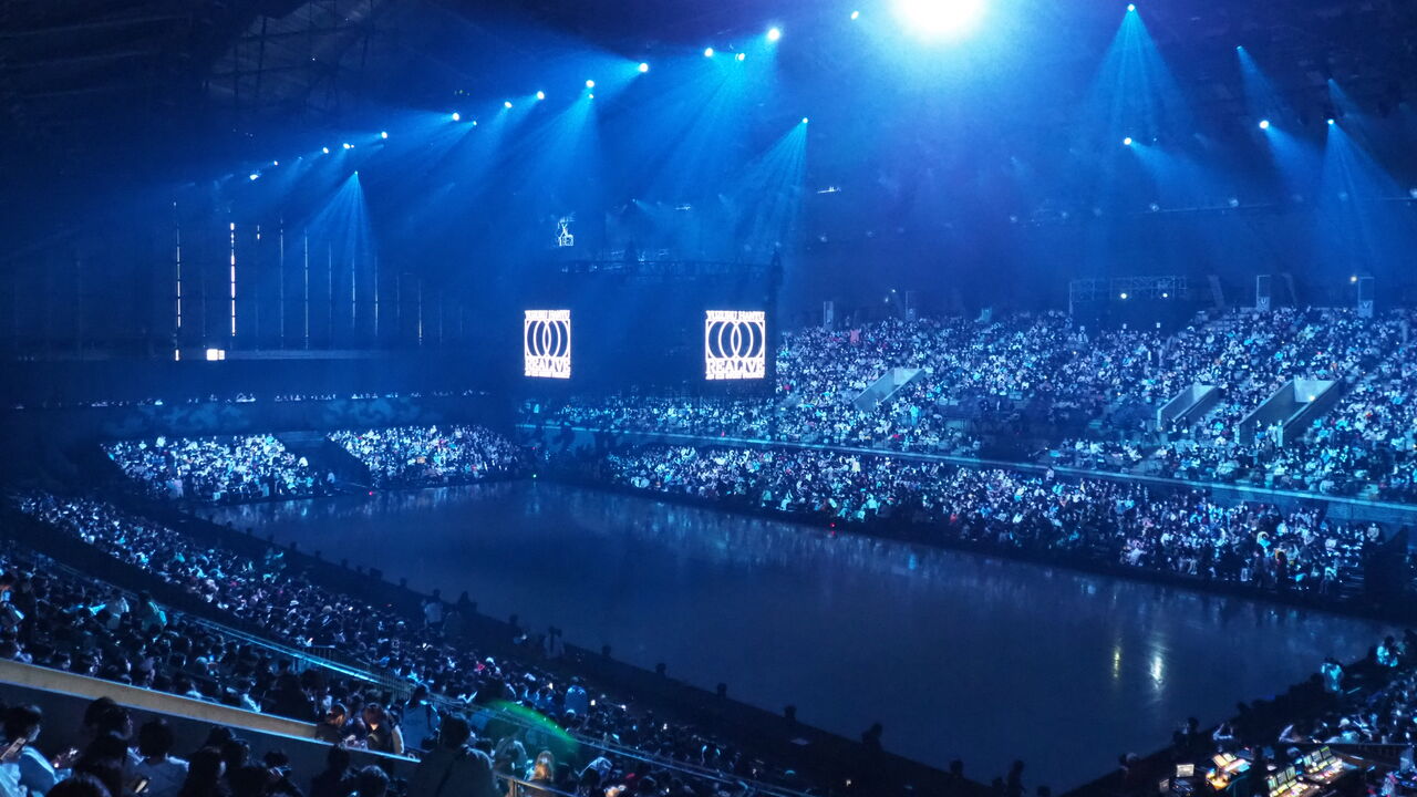 プロ転向以降の道のりを日数のカウントともにたどりながら「REALIVE」は終盤へ。これまでの3つのアイスストーリーのバランスを取るように、GIFTから「あの夏へ」、Echoesから「Utai IV〜Reawakening〜」を蘇らせます。録画した映像を見るとUtai IVでは画面全体が発光しているのですが、現地で見ると足元だけが一筋の青い光を帯びていて、それがとても美しくて、肉眼ならではの体験もさせてもらいました。その衣装のままSEIMEIが始まり、さらに「ありがとうございました!」で退場していったのには驚きもありつつも、すべてを終えてみれば納得の締めでした。REALIVEとしては、アンコール相当のものとしてのSEIMEI(※原点の「プロローグ」から引いたということのよう)まで演じて一度締まり、第2部からは内容が切り替わったものを見せる、そんなことだったのかなと思いました。