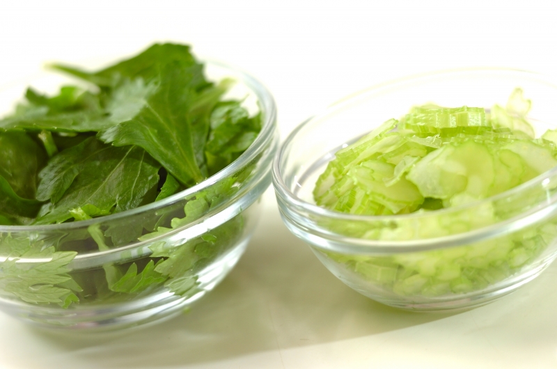 セロリは葉を摘み取り、軸は筋を取って繊維を断つように薄切りにする。