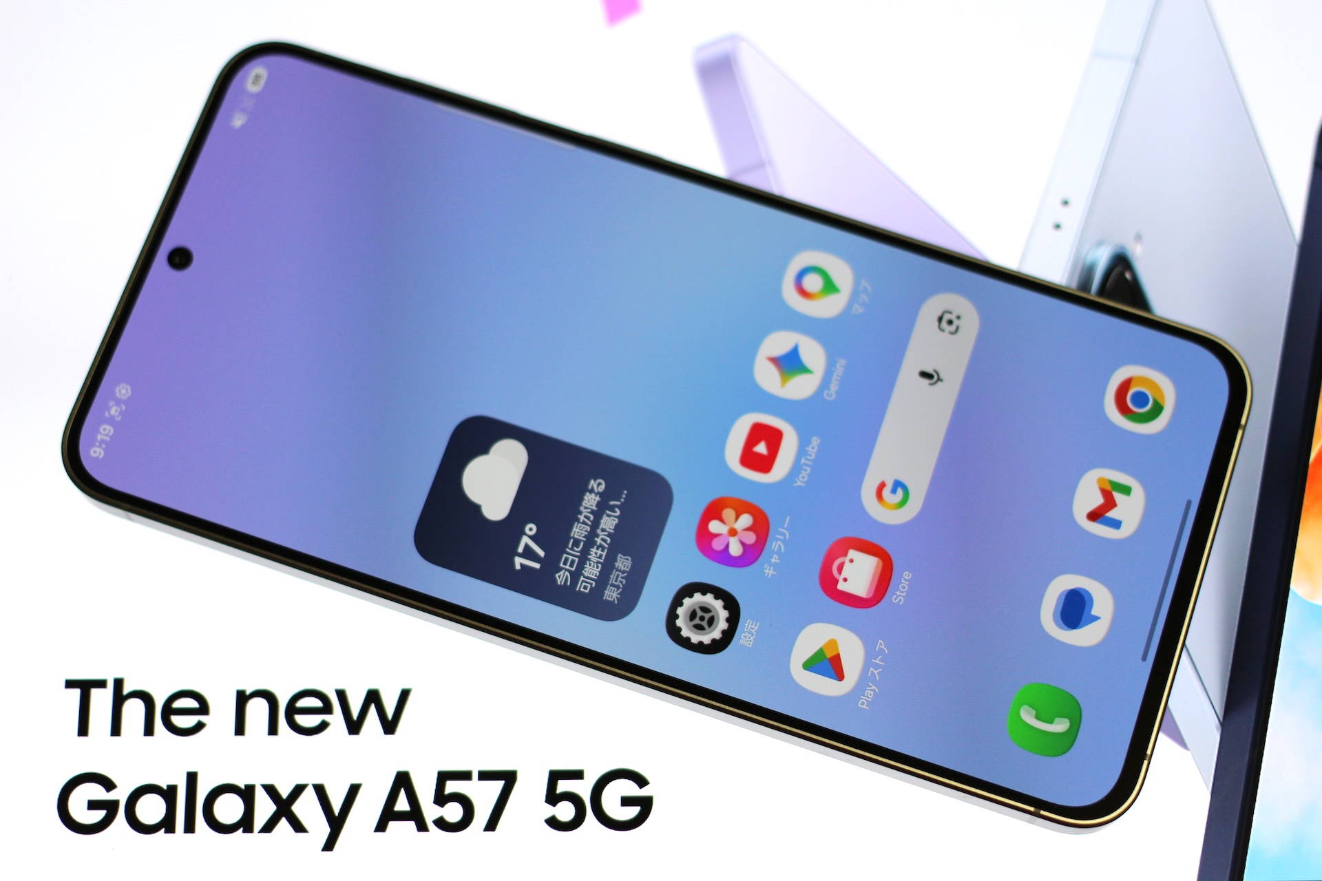 Galaxy A57 5Gの画面を表示している状態の前面。画面の周りの縁(ベゼル)はGalaxy A55 5Gよりも狭くなっているとのことで、実際に若干の違いではあるものの、Galaxy A5*シリーズで最薄・最軽量に