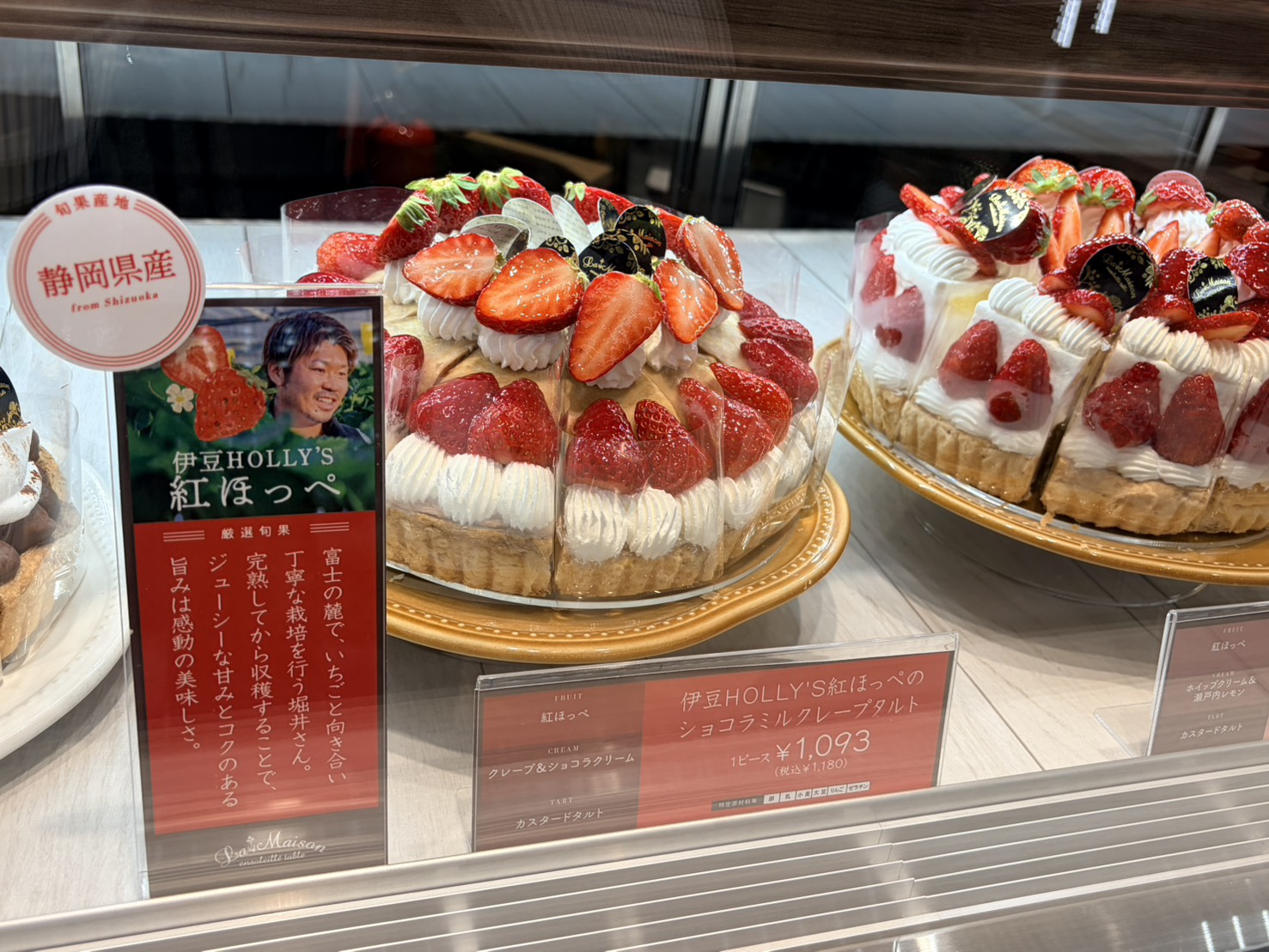 「ラ・メゾン アンソレイユターブル パティスリー」はこだわりタルトの専門店です。オープンを記念して登場したのがペリエ稲毛店限定の「伊豆HOLLY'S紅ぽっぺのショコラミルクレープタルト」です。パティシエが目利きしたこだわりのいちごを惜しみなく使ったタルト。