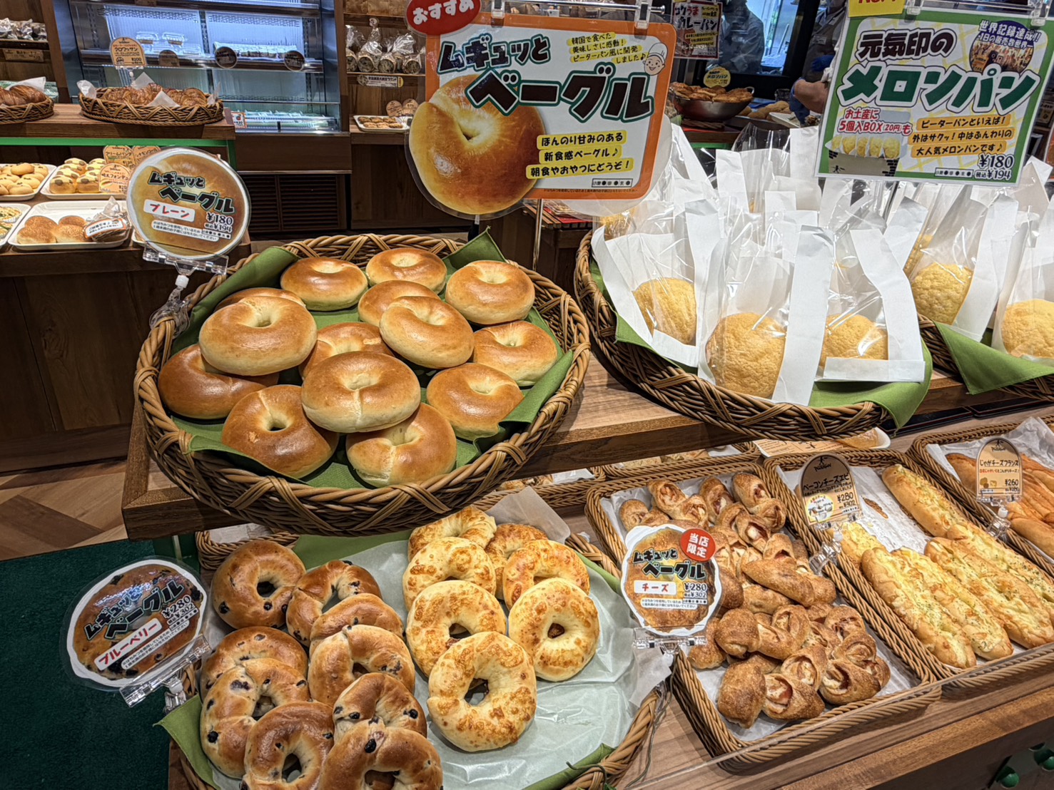 2015年には販売数で世界記録達成の「元気印のメロンパン」ほか、「ムギュッとベーグル」も人気。チーズ味はグルマリーナ限定販売です。
