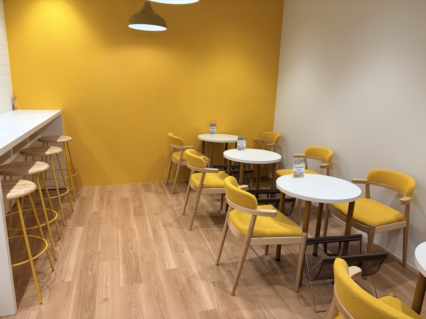 黄色がアクセントになったイートインスペース。