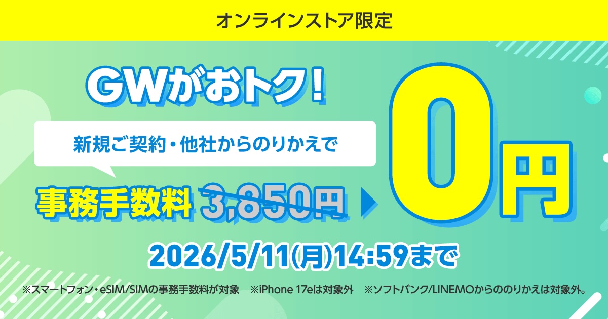 ワイモバイルオンラインストアにて新規契約やMNPで「GW事務手数料無料キャンペーン」が実施中!SIM単体なら最大1万5千ポイント進呈も