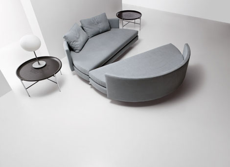 寝るときは丸いベッド、パーティのときは二つのソファーに分離します。