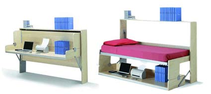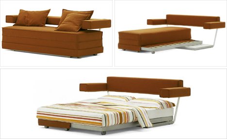 変形の仕方が格好いいソファーベッド。でもこの手のベッドって、シーツや布団どけるのが結局面倒だったりしますよね。