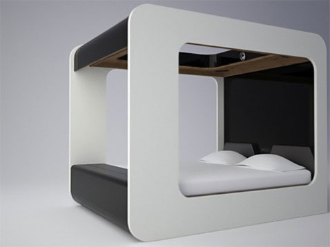 “High Fidelity Canopy”略してHi-Canと呼ぶそうです。 ベッドのボックス空間がシアターになっていて、足側一面のスクリーンで、インターネット、映画、ゲームが楽しめるそうです。