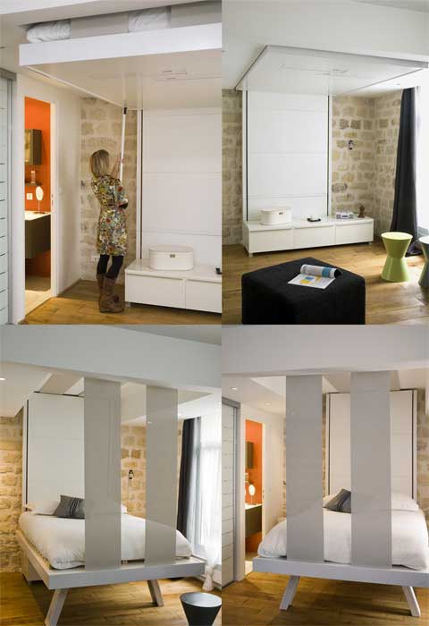 天井からダイナミックにベッドが下りてきます。空間が広々と使えて、狭い日本の住宅事情にはピッタリかも。ただ、何かのアクシデントでつぶされないか心配もあります。