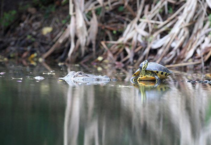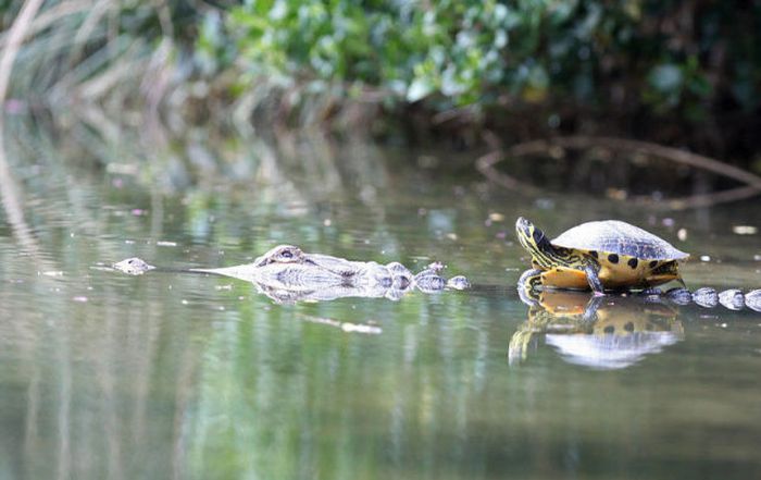 こちらサウスカロライナ州にいる、9歳のワニと15歳の亀の2ショット。