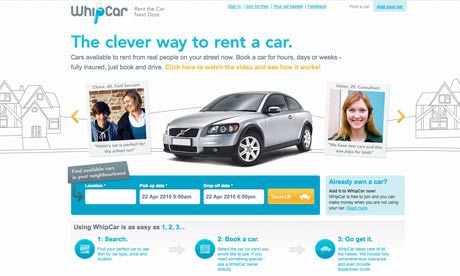 車の所有者がサイトに車を登録し、数時間あるいは数週間単位で近隣の人々にレンタルすると言うシステムで、WhipCar側は利益の15%を引いたレンタル料を直接所有者の口座に振り込みます。