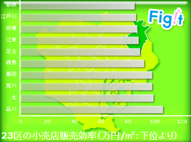 もっと深刻なのは、販売効率の低さだ。小売業では、売場面積1平方メートル当たりの販売額を「販売効率」と呼び、営業の効率性を測る指標に用いる。葛飾区は、その販売効率が23区で一番低い。
