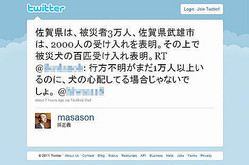 「武雄市長の樋渡さんは、漢です。もうじき3時から会見始まるそうです。 USTでも配信。 ow.ly/4u45GRT」「市長は被災者とペットの両方を受け入れて下さると思います。」