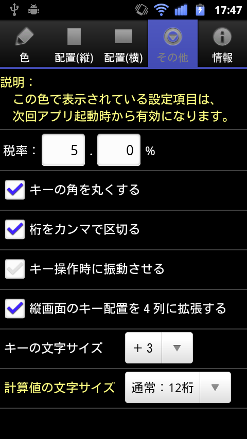 『その他』では税率の設定や角丸、キー配列を3or4列の指定などができます。