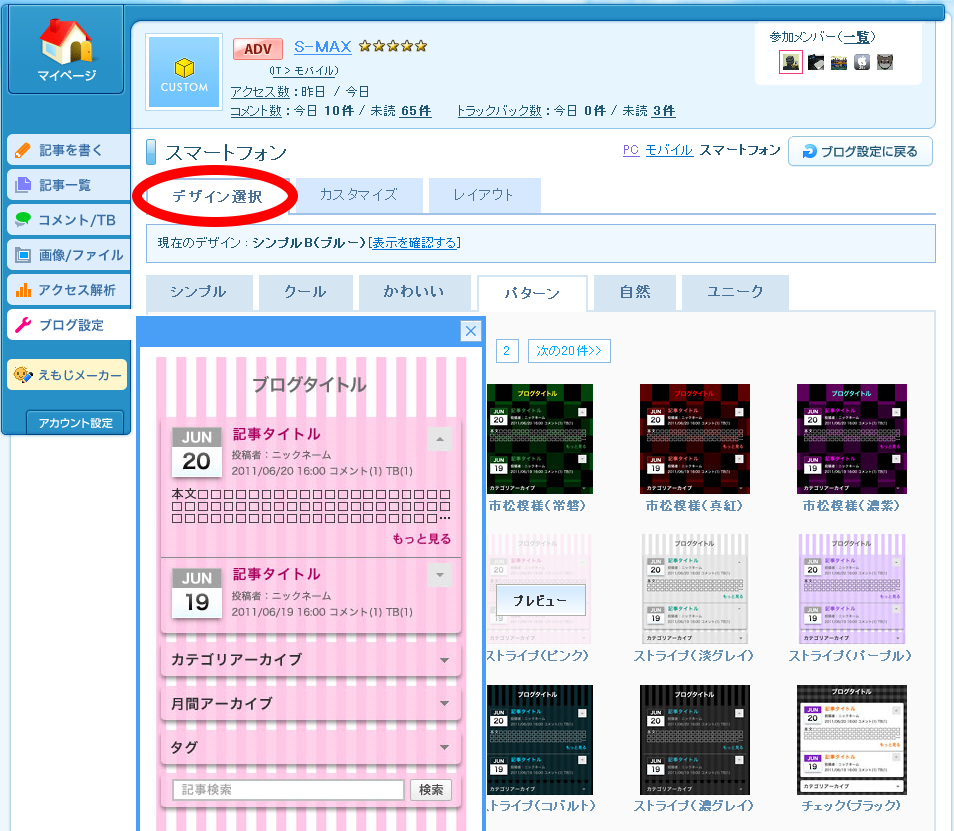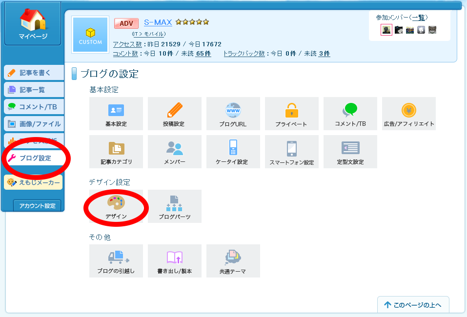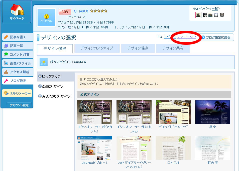 PC版の管理画面で「ブログ設定」→「デザイン」を選択する