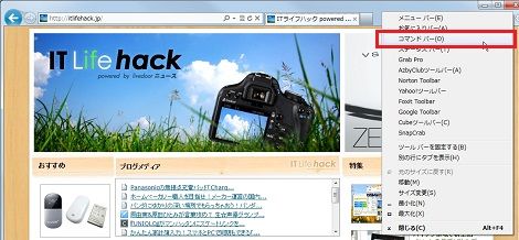 | 画面1 IE9上部のウィンドウ枠を右クリックし、表示したいツールバーを選択する。 |