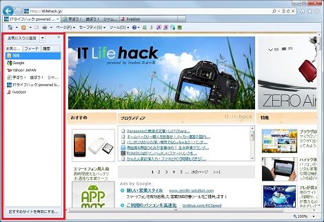 「お気に入り」の表示位置も、変更されている。IE8の操作に慣れているとついつい画面の左側から選ぼうとするが、IE9の表示位置は右側になっている。これは、ボタンをワンクリックするだけで左側に移動することが可能だ(画面5、6)。