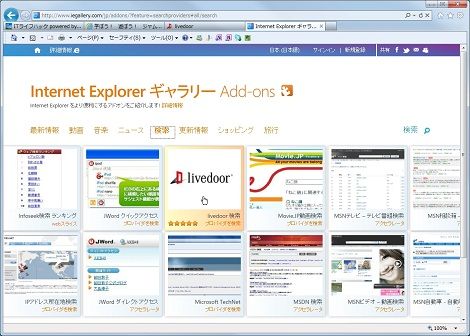 IE8で右上にあった検索ボックスは、アドレスバーと一体となった。アドレスバーに直接キーワードを入力して、ウェブサイトを検索できる。このとき、使用する検索エンジンは切り替えられる。いつも使っている検索サイトを選択しておこう(画面7)。もし、一覧にない場合には、[検索プロバイダーの追加]を選んで、追加することが可能だ(画面8)。