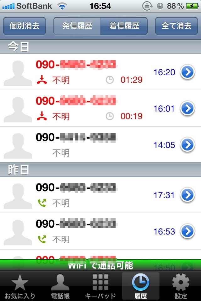 発信方法は、通常の通話と同様に、アプリのキーパッド表示から番号を入力するか、電話帳から選択して電話をかけるだけです。