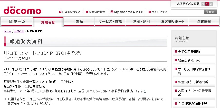 ・報道発表資料 : 「ドコモ スマートフォン P-07C」を発売 | お知らせ | NTTドコモ