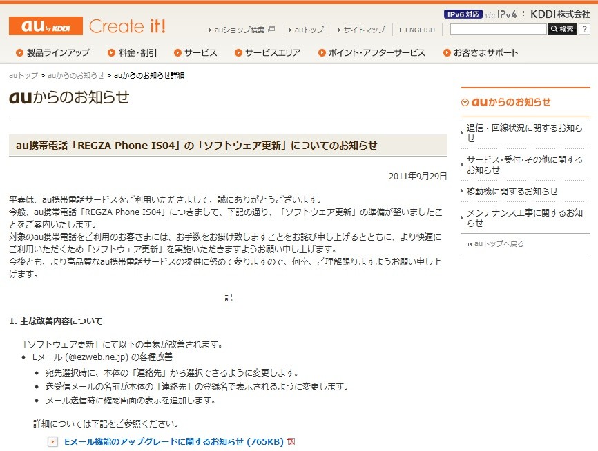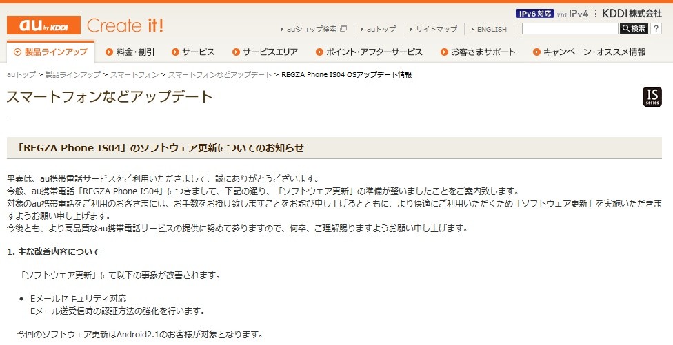 ・REGZA Phone IS04 OSアップデート情報 | スマートフォンなどアップデート | au by KDDI