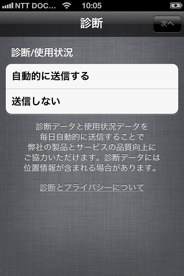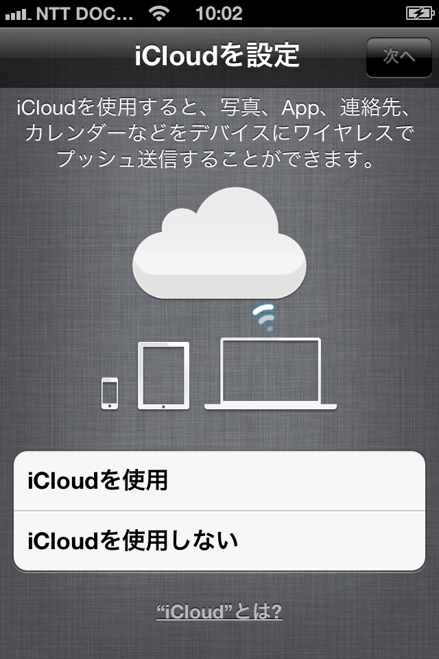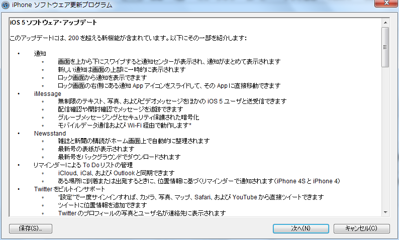 iOS 5で新しく追加される機能が表示されますので、確認して「次へ」を押します。