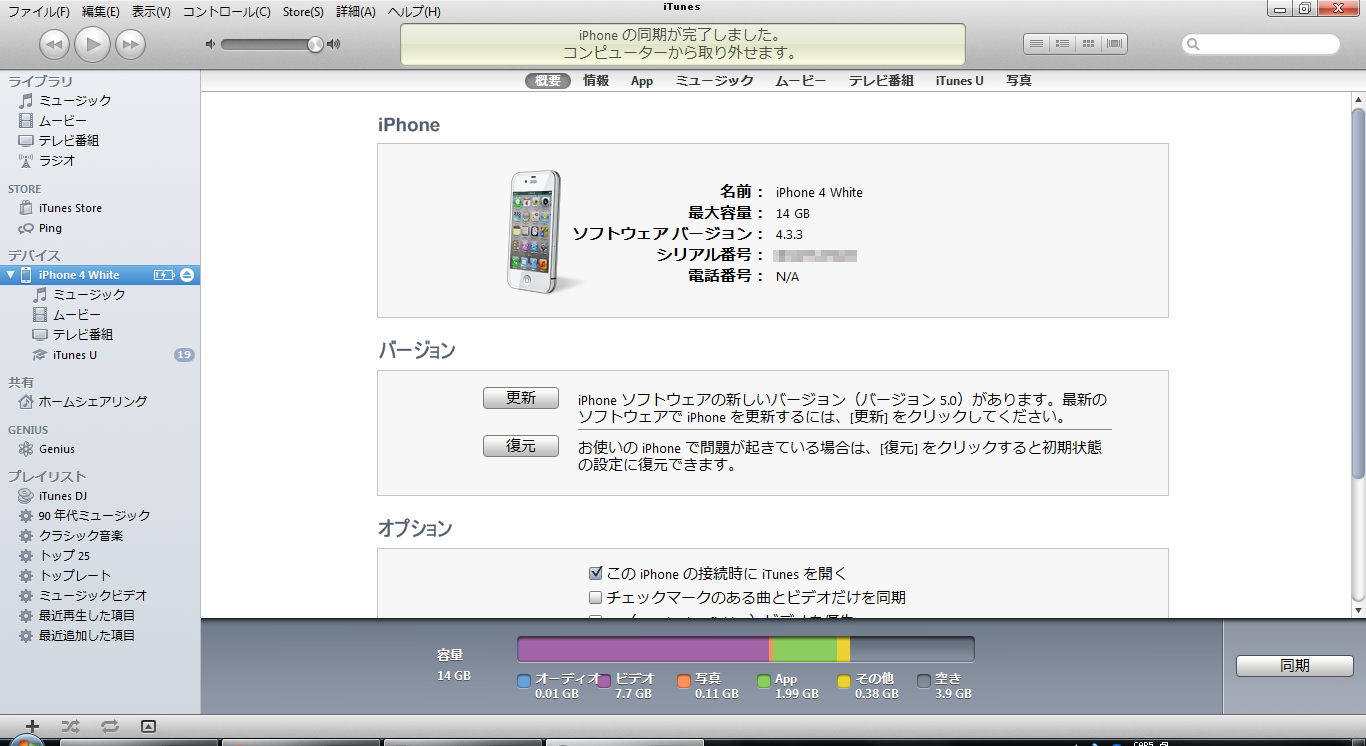 後は、待っていれば更新されます。かなり時間がかかりますし、今回、筆者の環境では、一度、復元に失敗したりしましたが、無事に更新できました。ソフトウェアバージョンが「5.0」になっているのがわかります。