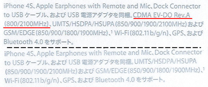 KDDI版のiPhone 4Sには対応通信方式に「CDMA EV-DO Rev.A」の文字が(写真=上)。SoftBank版にはCDMAの記載なし(写真=下)