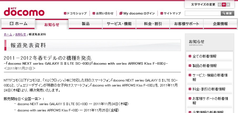 ・報道発表資料 : 2011−2012冬春モデルの2機種を発売 | お知らせ | NTTドコモ