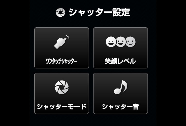 シャッター設定ではワンタッチシャッターや笑顔シャッターにも対応。