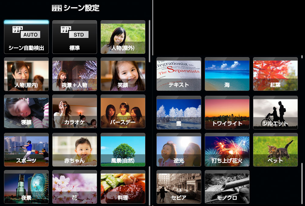 とても豊富なシーン設定が魅力です。通常撮影時は、オートモードでも充分綺麗に撮影できますが、特別なシーンでは切り替えて使うとより一層美しい撮影が出来るようになります。