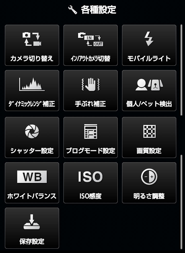 各種設定メニューには、豊富な設定項目が用意されています。インカメラも搭載されているので、イン/アウトカメラ切替は、自分撮りをする人には嬉しいポイントかもしれません。