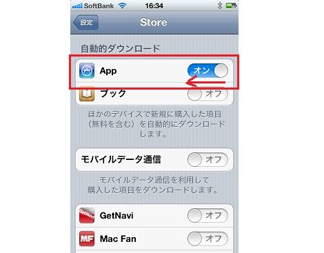 | 画面2 [自動的ダウンロード]の[App]を[オフ]にする。 |
