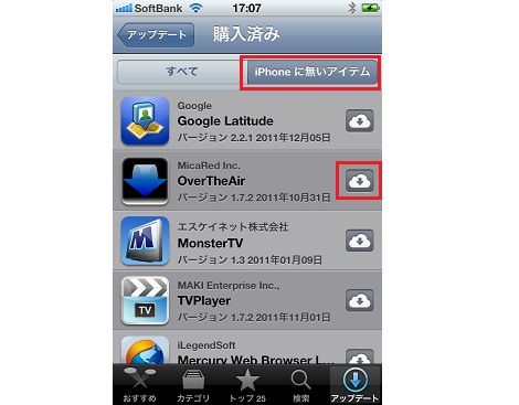 | 画面3 ホーム画面で[App Store]アイコンをタップ。[アップデート]で[iPhoneに無いアイテム]を選択。雲のアイコンをタップして、パスワードを入れればダウンロードできる。 |