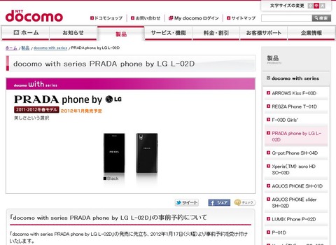 NTTドコモは、20日、世界的ブランド「PRADA(プラダ)」とコラボレーションし、高級感のあるデザインと機能性を兼ね備えたAndroid搭載スマートフォン「docomo with series PRADA phone by LG L-02D」を開発したことを発表しています。海外では、すでに、LGエレクトロニクスから発表済みですが、ドコモからも発売されることが発表されました。ドコモ版は、2012年1月に発売予定とのことです。■LGエレクトロニクス、プラダと共同で「PRADA Phone」を開発!2012年初めに発売予定