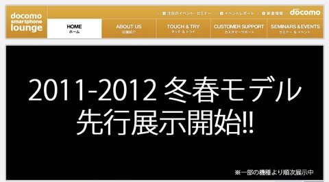 NTTドコモは、18日、2011年冬から2012年春にかけて発売する予定の新モデル「2011-2012冬春モデル 新商品・新サービス」の発表会を行い、総勢24機種の新商品を発表しました。その中のスマートフォンのうち「GALAXY SII LTE SC-03D」や「Optimus LTE L-01D」などのハイエンドモデルをはじめ、「ARROWS Kiss F-03D」「REGZA Phone T-01D」「F-03D Girls'」「P-01D」「GALAXY Tab 7.0 Plus SC-02D」の合計7機種について、ドコモのスマートフォンについてサポートするショールーム「ドコモスマートフォンラウンジ」にてすでに先行展示が行われています。上記7機種については、18日から先行展示が行われており、その後も10月27日からは、加えて「MEDIAS PP N-01D」「AQUOS PHONE SH-01D」「AQUOS PHONE slider SH-02D」「LUMIX Phone P-02D」の4機種の展示も追加されるとのことです。■NTTドコモ、Androidスマートフォン「LUMIX Phone P-02D」のカメラ起動ができない不具合でソフトウェア更新を提供開始