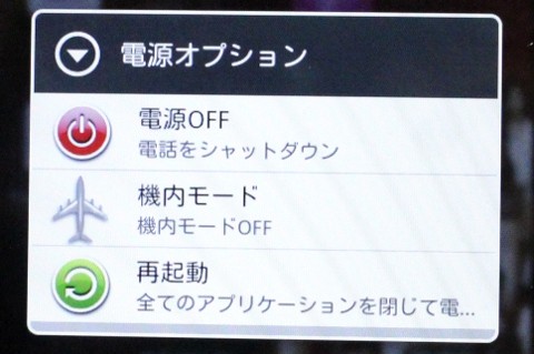 電源ボタンを押し続けると、機種によって名前は違いますが「携帯電話オプション」「電源オプション」という画面が表示されます。