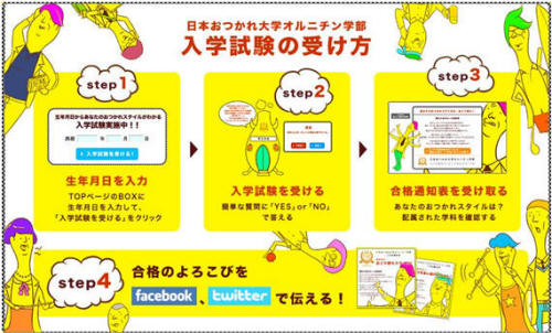 日本おつかれ大学オルニチン学部では、入学試験を受けると「あなたのおつかれスタイル」から配属学科が決まります。