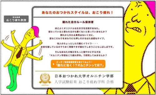 そんなお疲れに対して「あなたは何疲れ?」という診断が手軽に分かる日本おつかれ大学オルニチン学部の開校予告サイトができました。