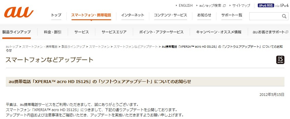 ・au携帯電話「XPERIA (TM) acro HD IS12S」の「ソフトウェアアップデート」についてのお知らせ | au