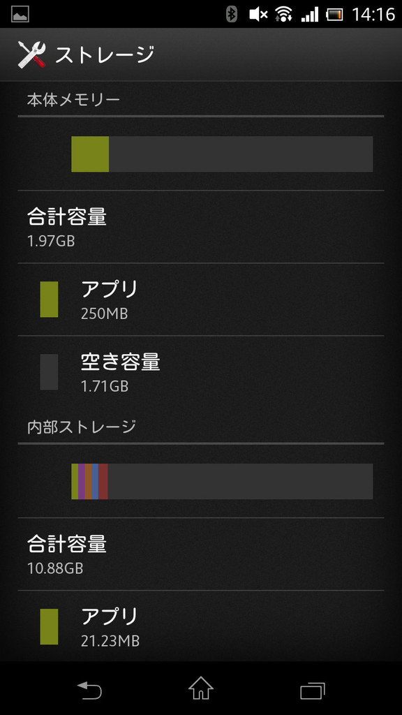 展示機の本体メモリーの空き容量は1.71GB(写真=左)。内部ストレージの空き容量は10.3GBとなっていた(写真=中央)。Android OSのバージョンは4.0.4(写真=右)。