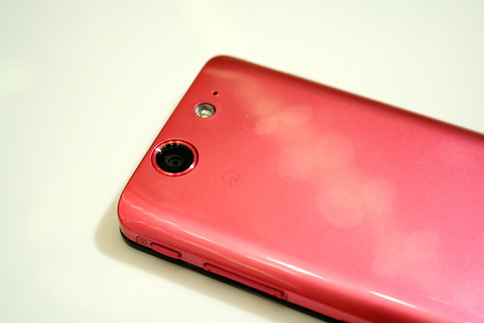 背面のカメラは約810万画素のCMOSを搭載し、カメラ周辺にはカメラ用のライト、FeliCaポート、スピーカーを搭載する。内側カメラは約31万画素のCMOS。