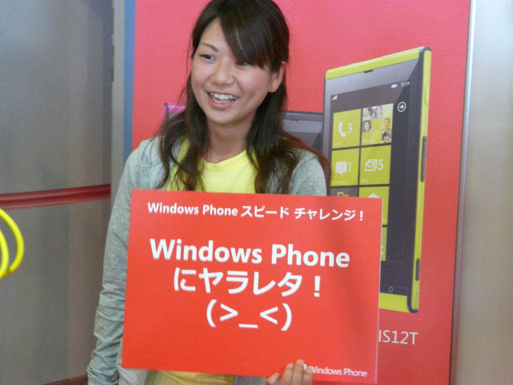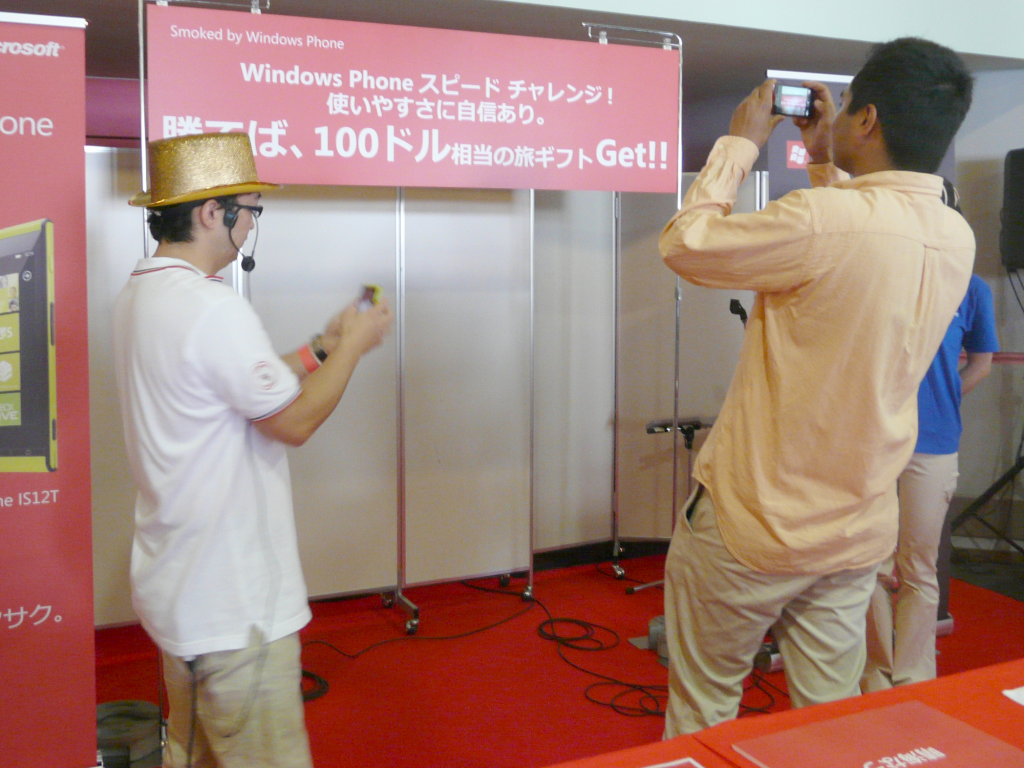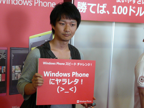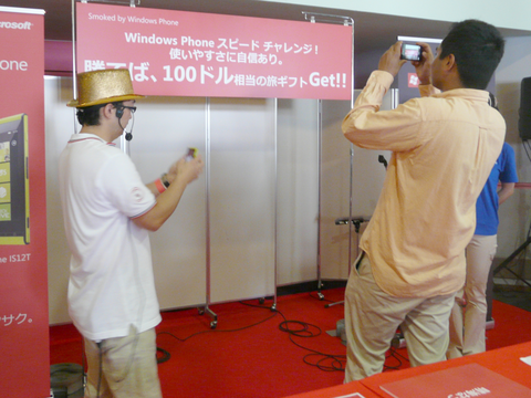 ここに、日本マイクロソフトが特設ブースを設け、「Windows Phone スピード チャレンジ!」と題するイベントを開催しました。このイベントは、その名の通り、Windows Phoneの“速さ”をそのほかのスマートフォンと競う、というもの。日本では、2回目の開催で、もしもWindows Phoneの方が“遅かった”ら、チャレンジャーに100ドル相当のカタログギフトをプレゼントする、という太っ腹ぶりも目を見張ります。