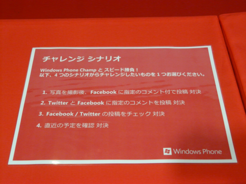 このチャレンジのルールはいたってシンプル。挑戦者(来場客)がスマートフォンでよく使うであろう4つのシナリオの中から1つを選び、Windows Phone 7を搭載したauの「Windows Phone IS12T」と操作時間で勝負。より早く操作を完了できた方が勝利、という寸法です。