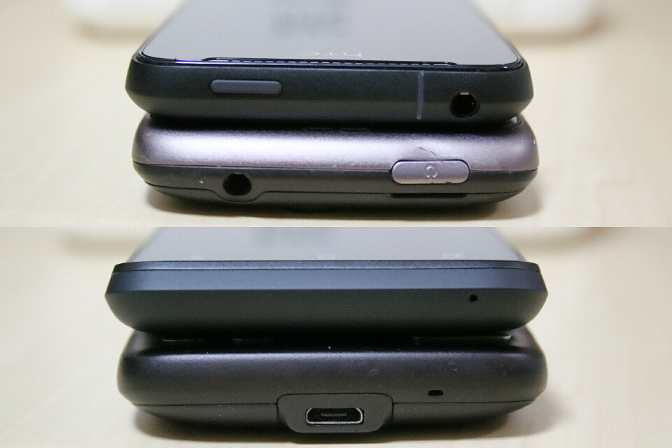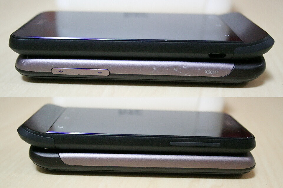 左右の側面を比較すると色々な違いが分かる。まずは、X06HTでは左側面に搭載されていた+−キー(上下キー)が、HTC One Vでは右側面に搭載されている。microUSB端子もHTC One Vでは左側面に搭載されている。